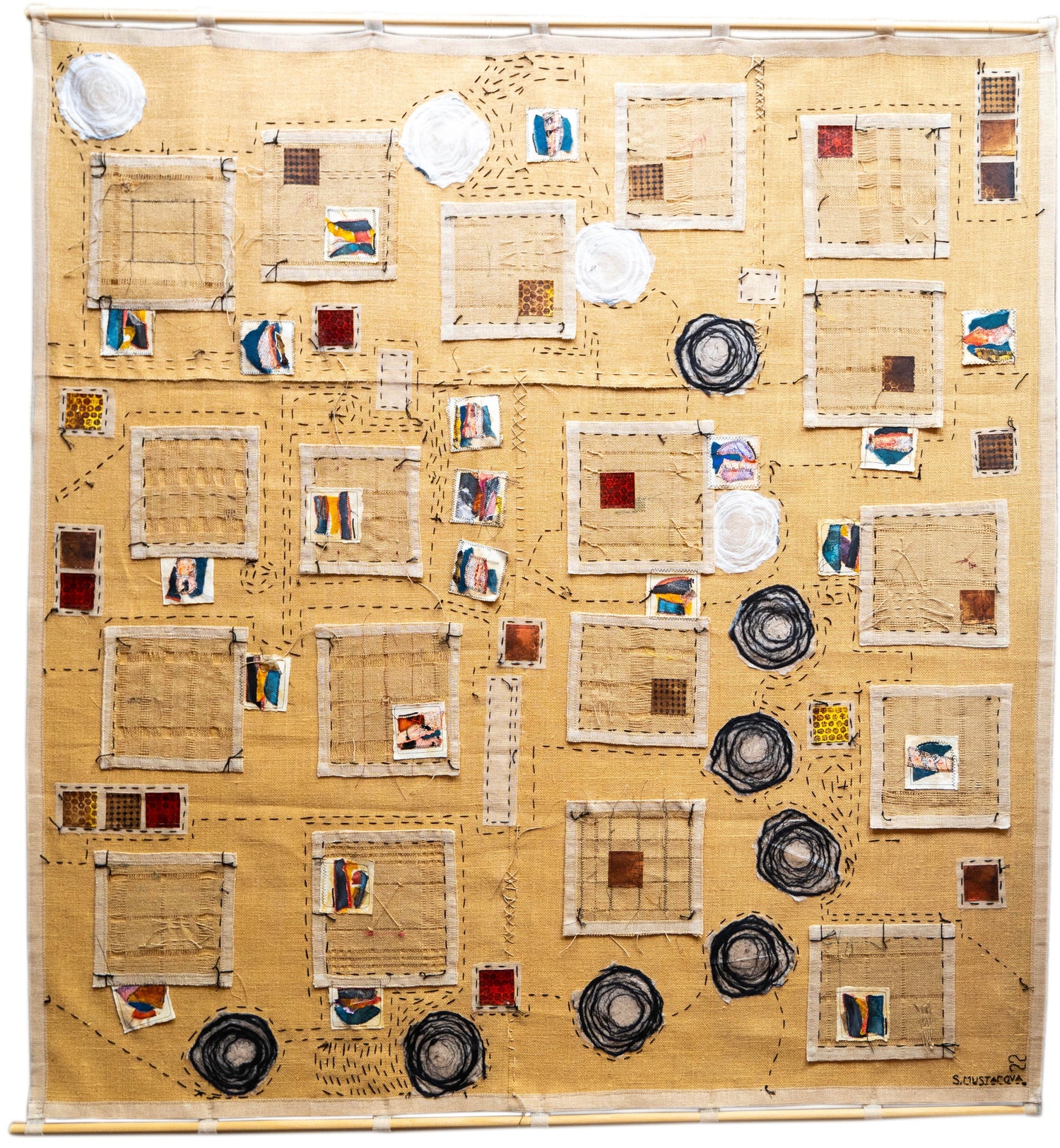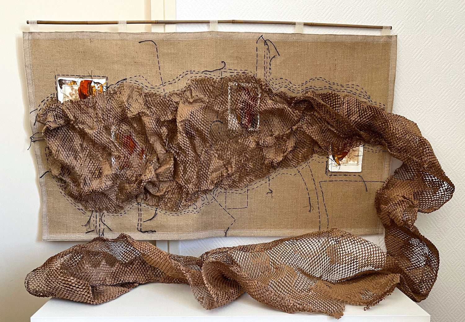 2022, Technique mixte : papier et jute suturé, 150 x 150 cm