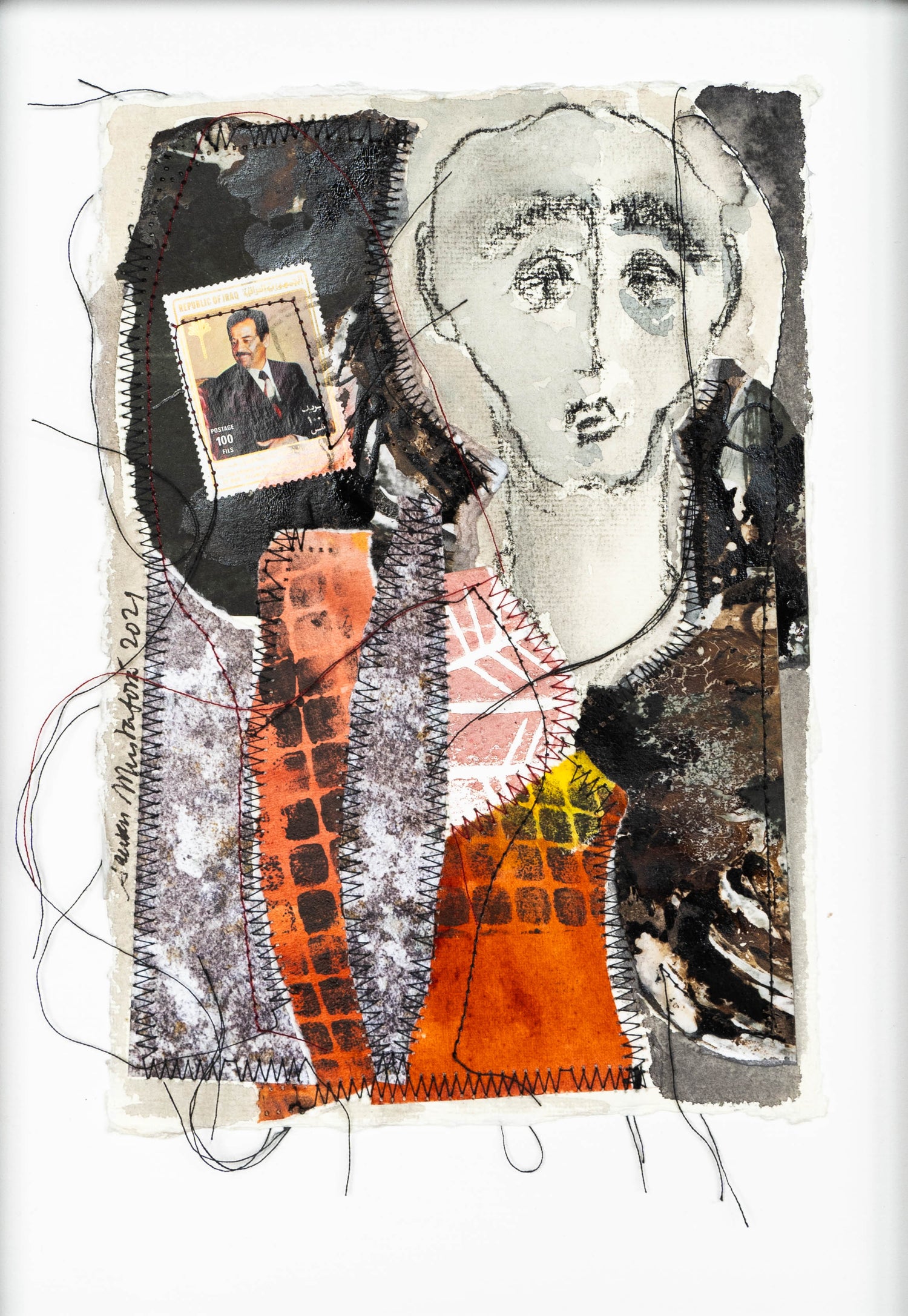 2021, Technique mixte : coton teinture végétale, acrylique, encre sur papier déchiré et suturé, 50 x 70 cm